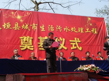 图为:县委书记宛庆丰宣布县城污水处理设施开工